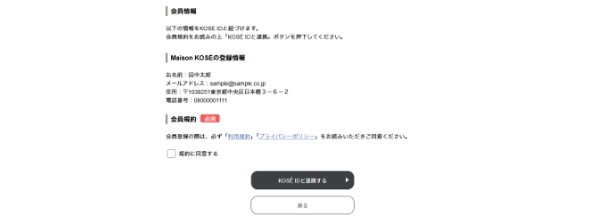KOSÉ ID連携する会員情報を選択内容と規約を確認