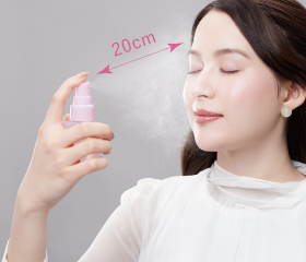 ○メイクの仕上げに、顔から20cmくらいはなし、目・口を閉じて顔全体にムラなくスプレーします。(10プッシュくらいが目安です。)